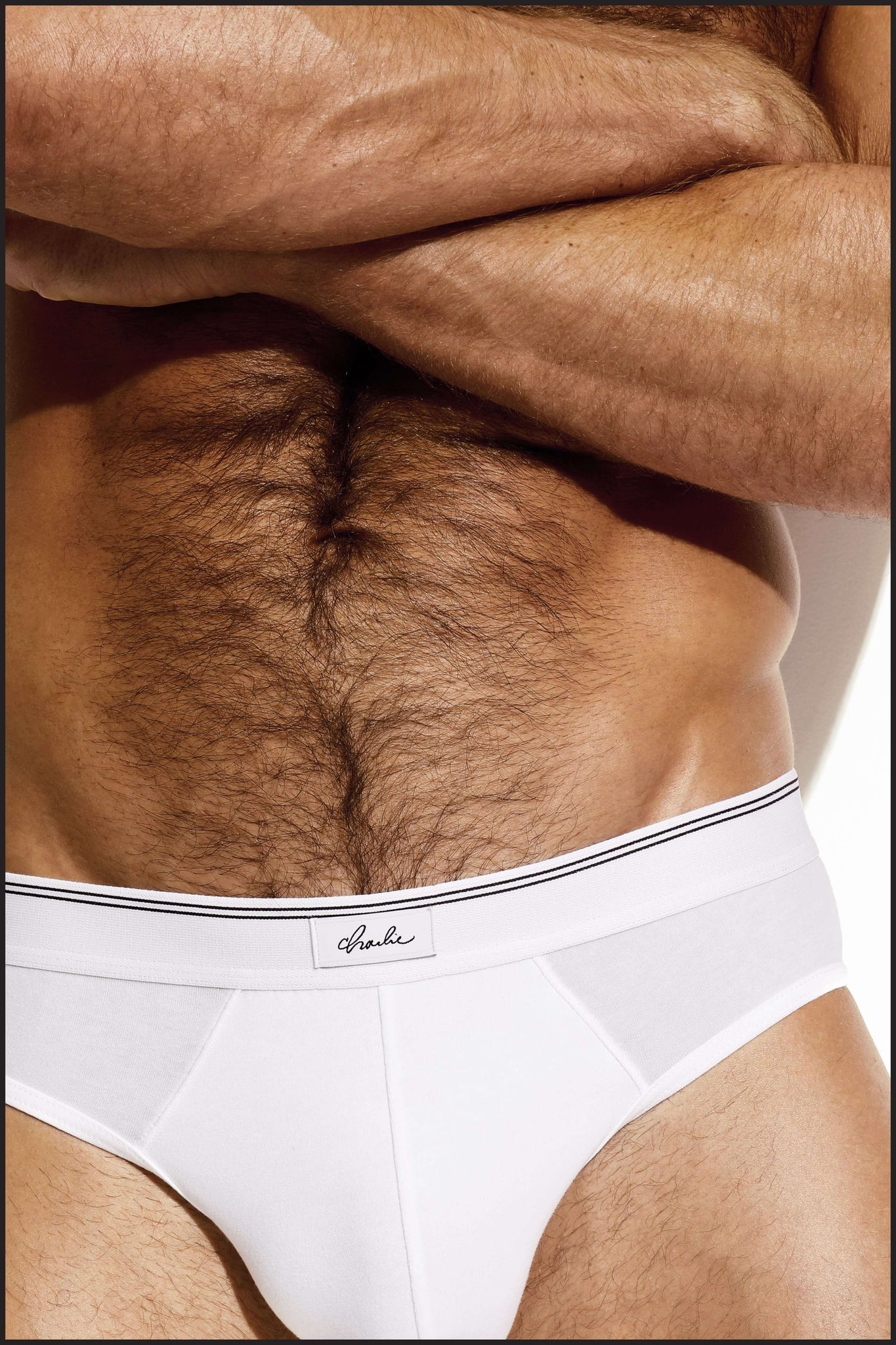 White Charlie Classic Brief with white Signature waistband elastic and label. Double-layer front pouch.