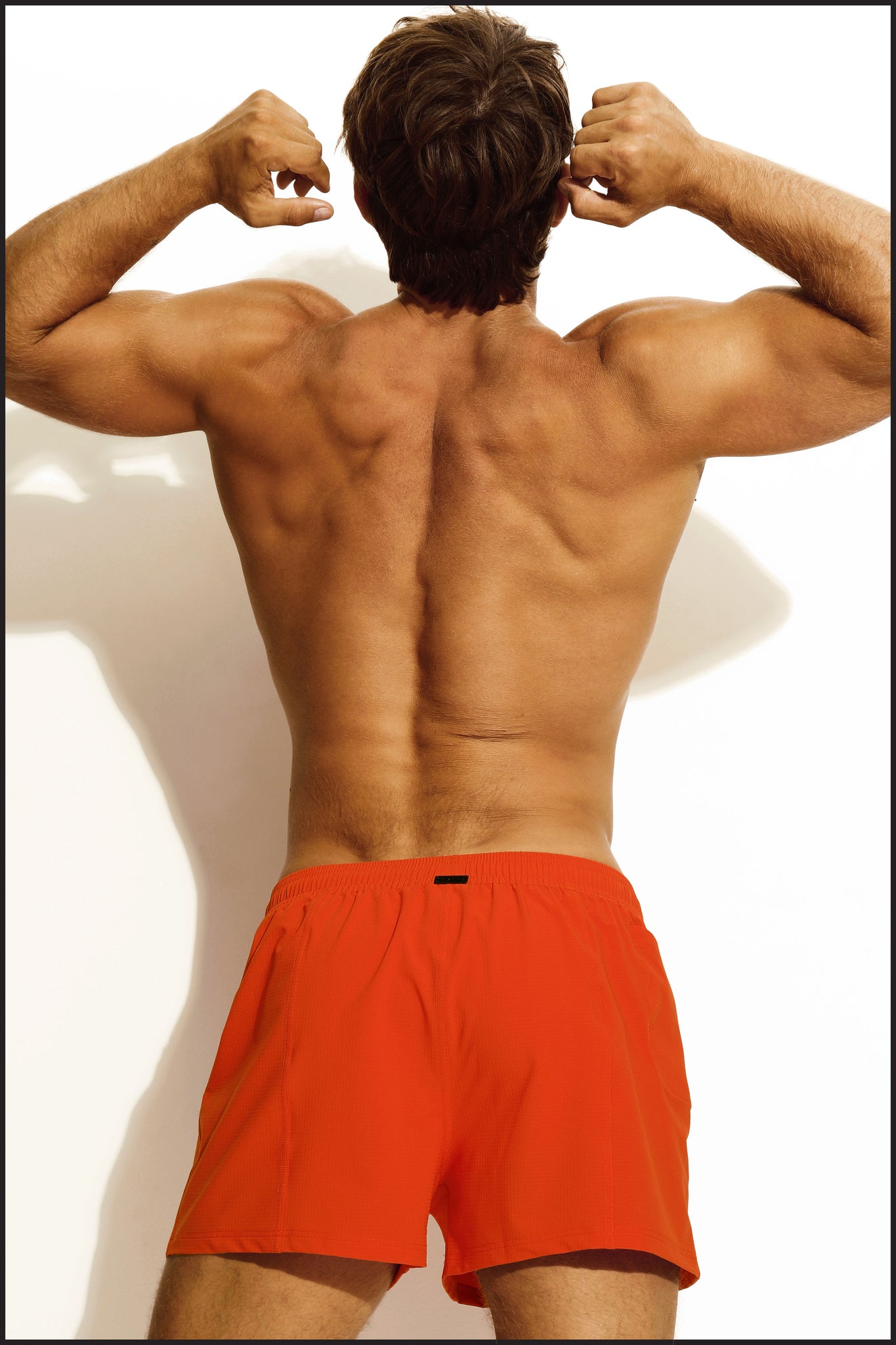 Charlie by Matthew Zink flame red ripstop Football Short is unlined with a drawstring waistband and a single right hip cell phone pocket. This Football Short has a similar fit to our Gym Short.
