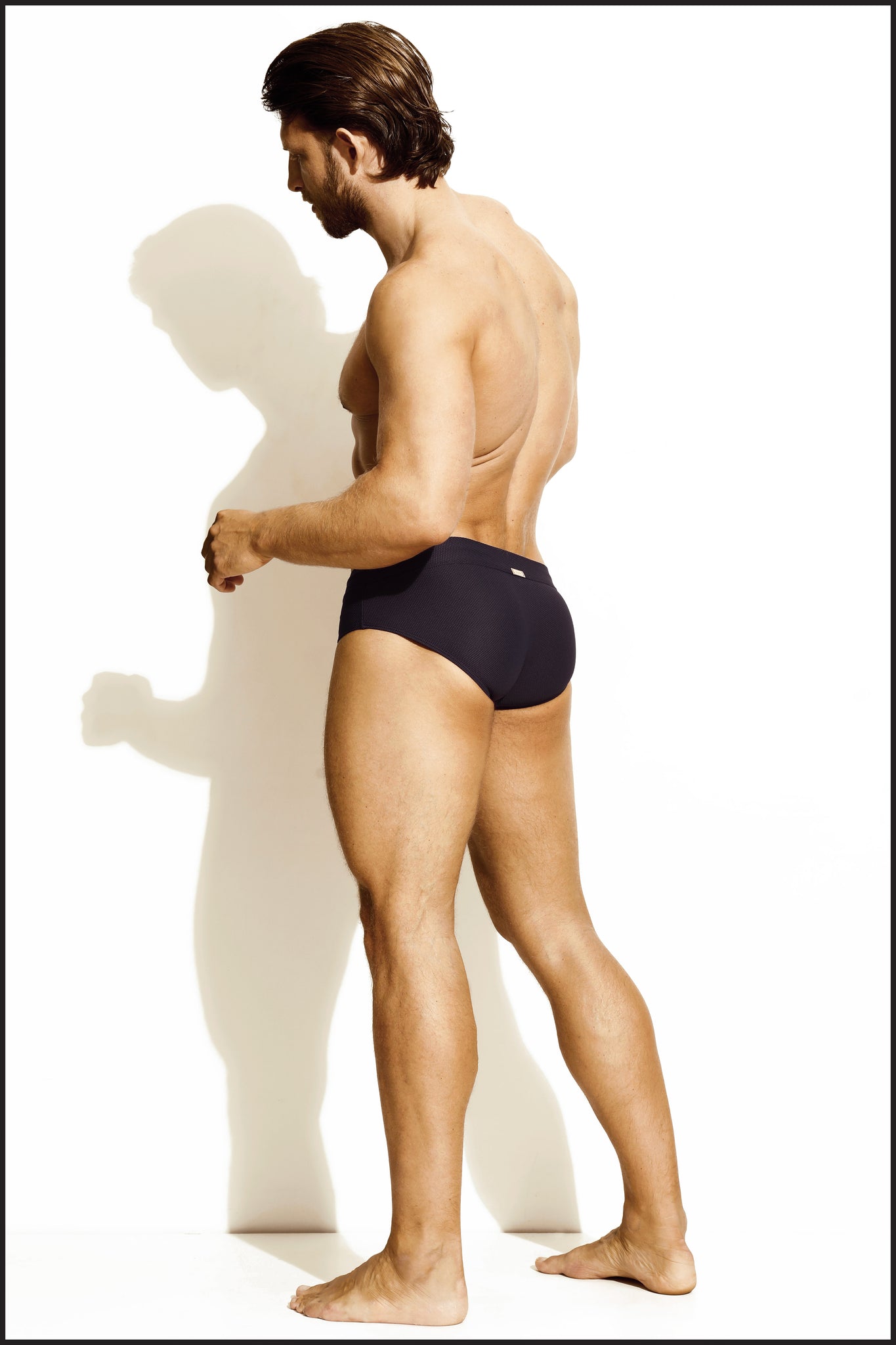 Classic Navy Square Cut Brief in our vintage textured fabric with elastic waistband, inside drawstring, and metal gold label. Front lined.