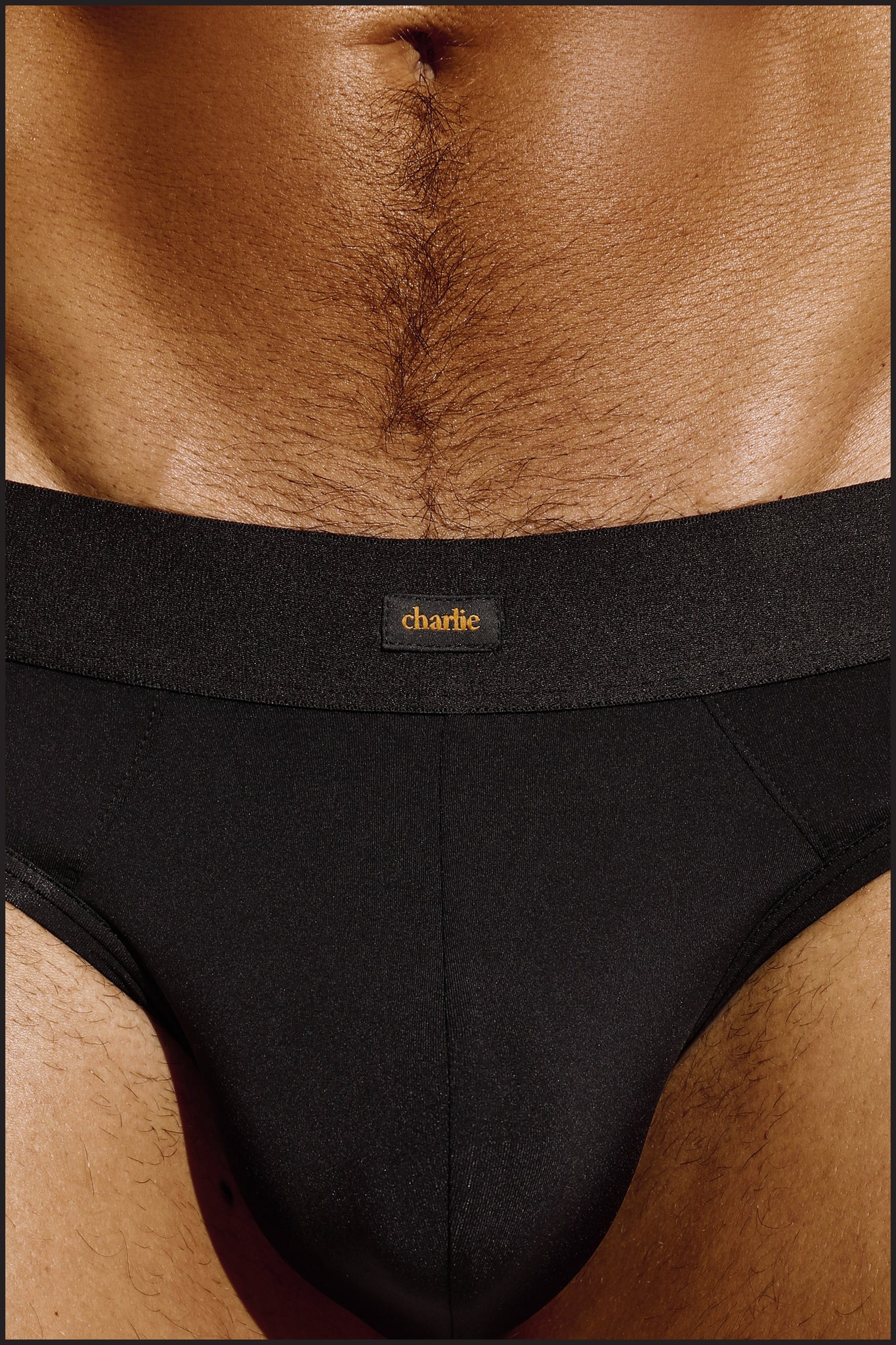 Charlie by Matthew Zink Black Classic Brief with 1 1/2" black logo waistband elastic and black label. Double layer front pouch.