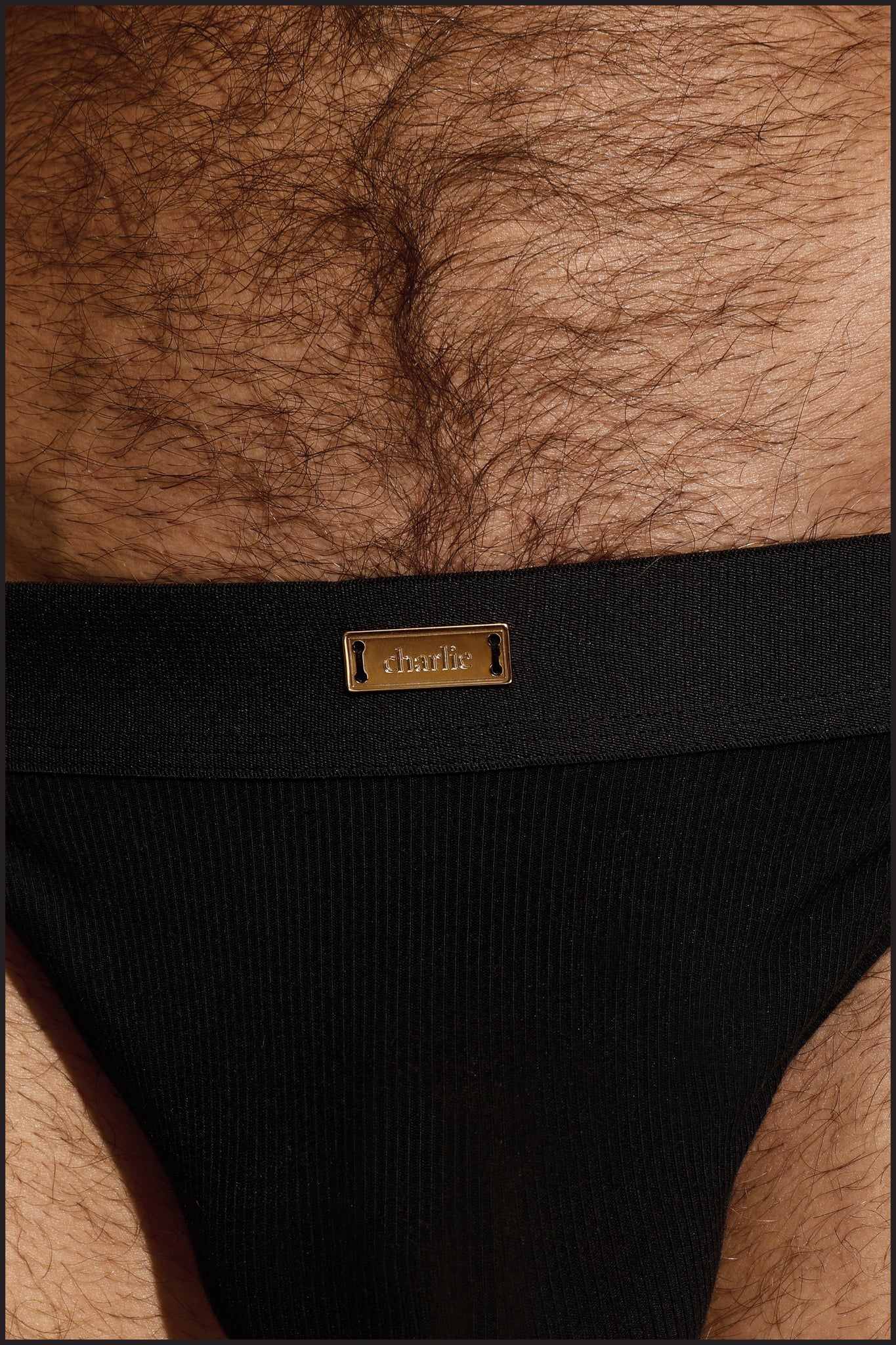 Charlie by Matthew Zink Black Ribbed Sport Brief with 1 1/2" black waistband elastic and gold Charlie label. Single layer front pouch.